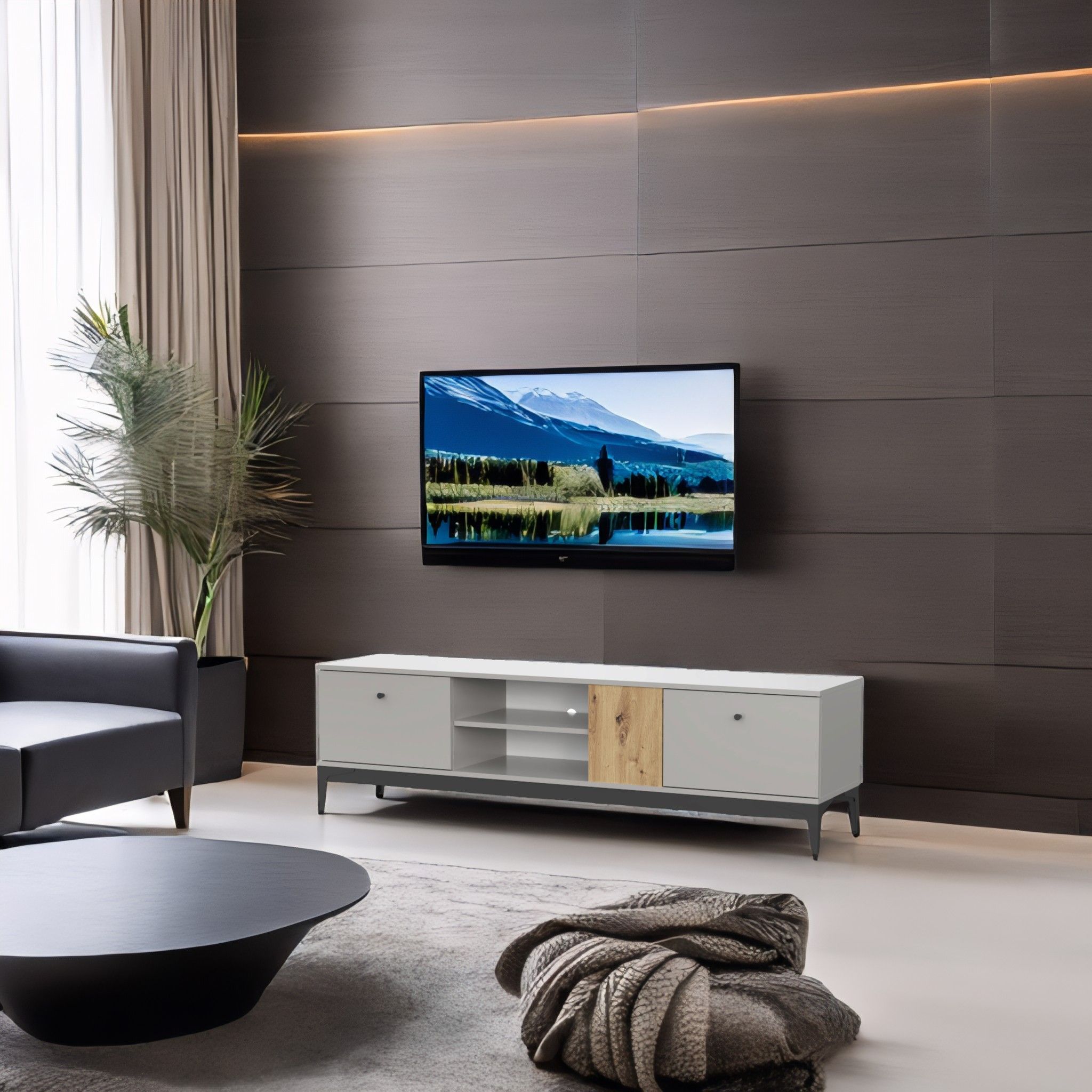 Планируя покупку, заранее определите место для тумбы. Поскольку телевизор и тумба воспринимаются как единый ансамбль, лучше всего выделить для них целую стену или значительную её часть. Это поможет создать целостную и продуманную зону отдыха.
